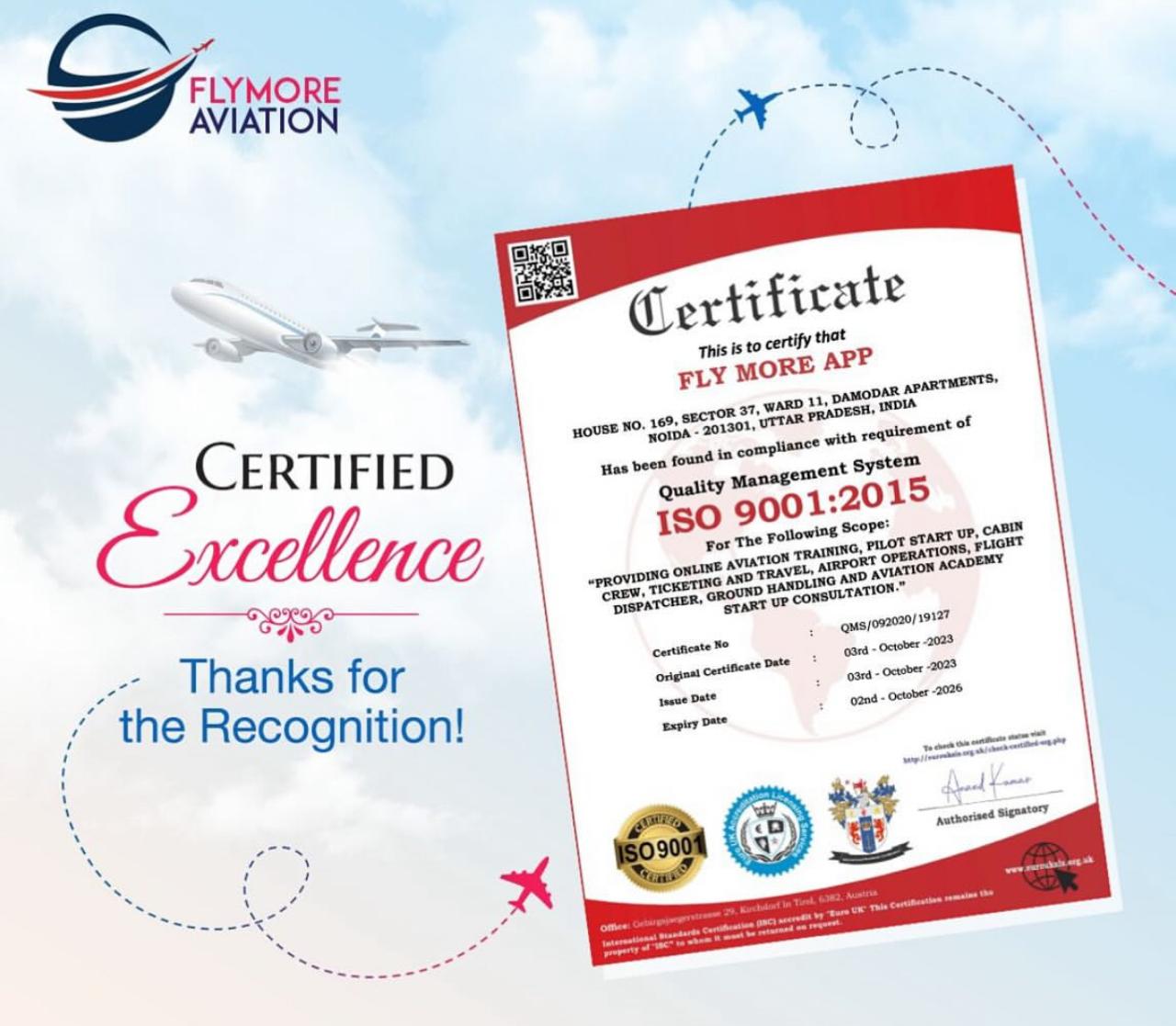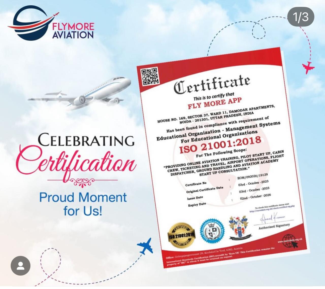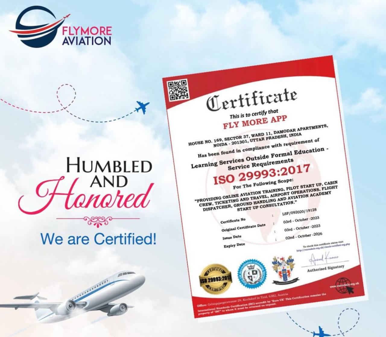 Industry Ready 100% Flexible Learning Online Guidance for advanced education Fly More Aviation We rest on solid foundations and great professionalism and preparation of strong passion for flying. An experience of 24 years.One stop shop for general aviation aspirants. Quality assurance experience in Aviation Industry. Read More Certificate of Recognition Courses Offered Cabin Crew Tranning Pilot Startup Program Founder Puja Rasne Email: puja.rasne@flymoreaviation.in Contact No: +91 99108 10052 Advocate on Record. Supreme Court Of India Amrita Sarkar Grievance Officer Email: amrita.sarkar@flymoreaviation.in Contact No: +91 99108 10052 Sr. Commander with one of the leading Airlines in India. Captain Amit Nigam Course Advisor Email: puja.rasne@flymoreaviation.inContact No: +91 99108 10052 Aastha Rasne Commercial Pilot Airbus-320 Type Rated Email: aastha.rasne@flymoreaviation.in Contact No: +91 99108 10052 D.G.C.A Approved Doctor Gp Capt (Dr) Pankaj Pant DGCA Regn No. - 033 Dr. Manu Tiwari MBBS, DNB Psychiatry Senior Psychiatrist Psychometric Testing Expert ISO Recognition Certificate Gallery Get in touch with us For Calling and WhatsApp+919910810052Email Idpuja.rasne@flymoreaviation.in GST No : 09AAKFF6987D1ZX UDYAM REGISTRATION CERTIFICATE : UDYAM-UP-28-0175878